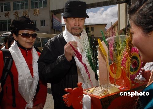 3月24日,孙海英、吕丽萍夫妇受邀参加“5.12中国爱——中国娇子爱心行动”,在西藏进行一系列爱心公益活动。抵达西藏,孙海英、吕丽萍夫妇受到当地民众的欢迎,藏族美女给孙海英敬上了大碗青稞酒。中新社发 龙昊 摄
