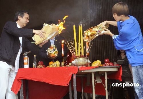 四月十六日,“第二十八届香港电影金像奖颁奖典礼”在文化中心大剧院举行拜神仪式。电影金像奖董事局主席陈嘉上导演(左)与金像奖司仪之一何韵诗进行传统的拜神仪式,祈求演出顺利。电影金像奖颁奖典礼将于十九日晚于文化中心大剧院隆重举行。中新社发 邓庆乐 摄