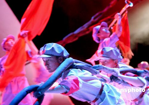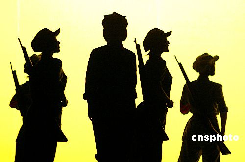 7月3日,北京国安剧院《十送红军》演出中红军女战士的英姿剪影,勾起观众对红军长征峥嵘岁月的怀念。2006年是红军长征胜利70周年,中国各地陆续举行形式多样的活动,纪念历经艰难曲折最后取得辉煌胜利的这一举世无双的革命史诗。中新社发 廖攀 摄