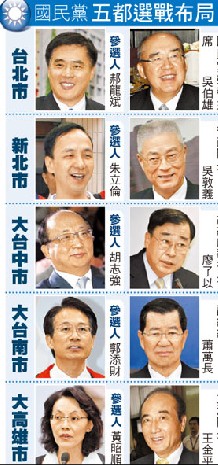 据了解,党中央规划的阵容,大高雄市由王金平出任,台北市由吴伯雄担任,新北市交给吴敦义负责,大台中市是由曾任台中县长的廖了以担纲,大台南市则由出身嘉义市的萧万长出马。
