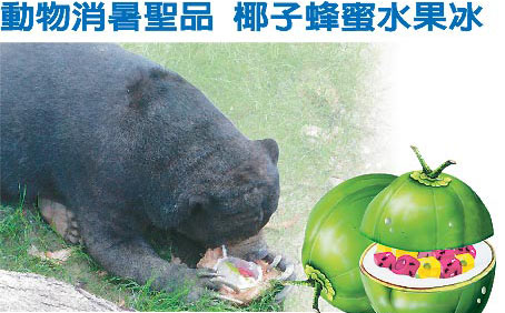 “我们看到南台湾有很多椰子,想到利用椰子壳制成水果冰,给动物消暑”,突发奇想的动物园管理中心主任张博宇说,椰子壳里装蜂蜜水及水果,冰冻后就成为可口冰品,动物闻到蜂蜜味道,边舔边剥开椰子,吃里面的水果和椰子肉。