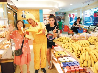 上月他突发奇想,订做一套搞怪香蕉装,“用这个来宣传一定有效!”店内农家出身的店员黄柏诚自告奋勇,“让我来当香蕉超人吧!”