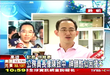 中新网7月26日电 据台湾TVBS电视台报道,陈致中卷入召妓疑云,也让另外一个人有点困扰,那就是高雄市政府社会局的课员张福仁;跟陈致中同年龄,身高比陈致中高一点,两个人乍看之下还真的有点像,走在路上,偶尔会被人说长的像,虽然不反感,但神似陈致中,在这敏感时期还真是有点尴尬。