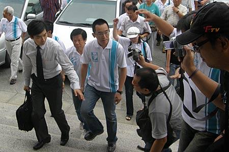 陈致中(前左 2)被《壹周刊》爆料疑涉召妓。陈致中26日由律师陪同到高雄地方法院提出民事告诉,向《壹周刊》求偿新台币200万元。 图片来源:“中央社”