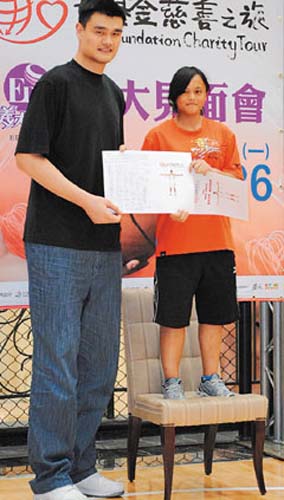“哇!好高,真的是巨人!”身高只到姚明腰部的桃源中学一年级女学生杜俪馨,代表上台致赠卡片时,特地搬了张椅子垫高,画面很有趣。