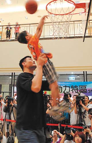 姚明说,很高兴到高雄县和灾区小朋友聊天交流,“希望能带给大家愉快的体验”。他教导学生们灌篮技巧,以简单的互动教学,传达他的爱与关怀。