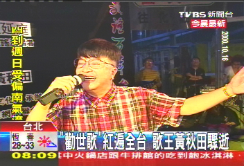 中新网8月3日电 据台湾TVBS电视台报道,曾于上世纪60年代以一首《劝世歌》红遍台湾,还演过电影《温泉乡的吉他》男主角的民谣弹唱歌王黄秋田,于7月31日,因突发心血管阻塞在进行血管绕道手术时,诱发感染而宣告不治,享年71岁。