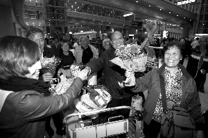 昨晚,首批被困北京游客抵京。20时刚过,游客纷纷走下飞机,多为白发老人。在接机口,神舟国旅工作人员将鲜花送到老人手上,老人们表示感谢,“我们命大,感谢大家关心。”