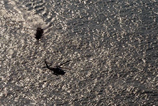海上船只及低飞的直升机沿着海岸线来回寻找。