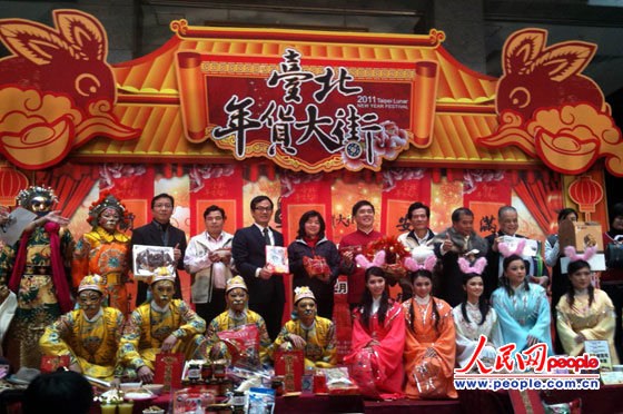 台北市年货大街将于1月15日热闹开卖。12日,台北市政府与六大商圈共同举行记者会,提出“价格公道”、“货源充足”、“亲子同乐”、“安全无虞”和“满载而归”五大保证,并展示丰富多彩的“好康(又好又便宜)”年货商品。图为台北市长郝龙斌与各大商圈代表展示特色年货。(