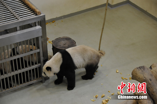 清晨和傍晚分别是大熊猫活动较频繁的两个时间,也是入洞房的良辰,台北市立动物园8日特别用录音机放出大熊猫发情的叫声给“团团”听,刺激“团团”能跟上“圆圆”的脚步,也让“团团”隔着栏杆和“圆圆”互动。