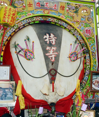 12头神猪以鲜花、彩带等装饰后,在锣鼓阵头引领下游街,最后回庙前广场祭祀,香客为争睹神猪风采,人潮一波波,几乎挤爆广场,祭典结束举行“开猪礼”重头戏,斩猪头后开始分食神猪肉。
