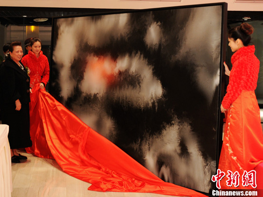 11月18日,“台湾知名画侣”严隽泰夫妇以“重庆—重庆”为主题在重庆举办油画艺术展,吸引众多当地美术爱好者和市民前去参观。图为严夫人许婉瑱(左一)为《云罗》揭幕。 中新社发 郭晋嘉 摄