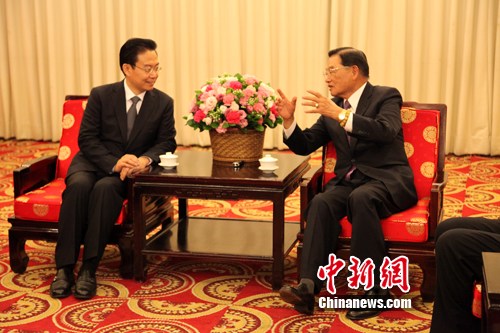 3月27日,台湾海基会董事长江丙坤在台北圆山大饭店会见并宴请福建省省长苏树林(左一)一行。中新网发 记者 陈立宇 摄
