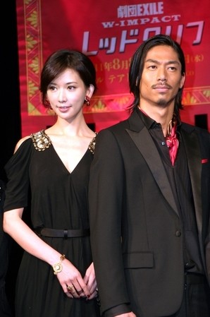 林志玲与AKIRA舞台剧配对。2011年7月11日,台湾名模林志玲穿低胸礼服在东京出席她首演舞台剧「赤壁」记者会。她饰演小乔一角,与她配对演周瑜的是日本红团“放浪兄弟(EXILE)” 的AKIRA。图片来源:台湾“中央社” 记者杨明珠东京传真