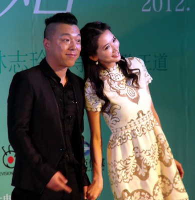 林志玲降低高度 依偎黄渤。台湾第一名模林志玲(右)将主演电影《101次求婚》,2012年2月14日在记者会上“降低高度” 依偎在男主角黄渤身上。图片来源:台湾“中央社” 记者康世人北京摄