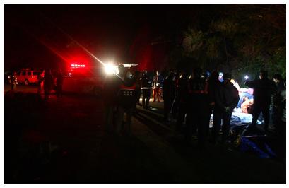 新竹县尖石山区9日发生游览车坠谷意外,警消接获报案后到场处理,陆续抢救伤员和处理罹难者遗体。(图片来源:台湾“中央社”记者邱俊钦 新竹县摄 )