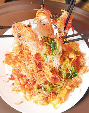 捞鱼生的重点在“捞”,一边捞一边说出风生水起、年年有余、岁岁平安等吉祥话。图片来源:台湾《中国时报》
