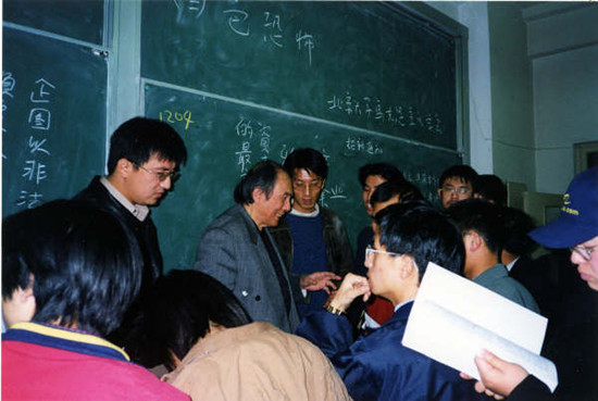 演讲刚刚完毕,青年学生就拥到讲台前,围着林书扬问这问那(图7,林书扬在北京大学演讲后与同学们交谈,吴小珊拍摄)。他们对世界充满好奇,问得相当大胆:“我有些迷惑,请问白色恐怖与红色恐怖比,哪一个更恐怖?”、“你对魏京生出狱作何感想?”、“你对李敖竞选台湾领导人怎么看?”、“你对陈水扁怎么看,他是代表谁的利益?”、“林先生作为本省人,当统一联盟主席,会不会被骂作台奸?”、“本省人有多少人留恋日本统治?”,甚至问到“你究竟拿了共产党多少钱?”、“你坐牢34年有政治上的灰心吗?”、“出来后看到台湾的变化有何感触?祝您健康!”林书扬不急不火,一一作答,让我们看到他对未经世故年轻人的体谅和包容。至今我相信,他的那番结语会永远在未名湖畔回荡:“我一会儿没有过后悔。内心支持我的是——进步必须有代价,代价必须有人承担,那就由我们承担!”