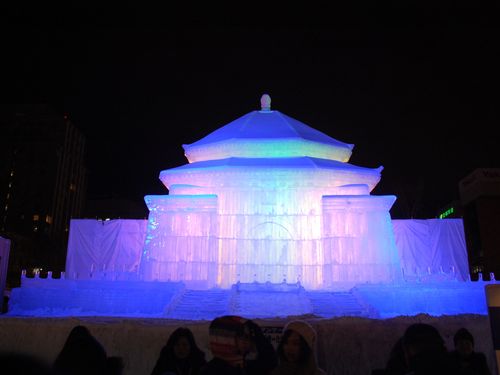台湾方面去年在札幌雪祭推出台北故宫博物院,今年是中正纪念堂冰雕,制作的水是取自北海道以澄清著名的支笏湖湖水,在阳光下会发出湛蓝的光芒。