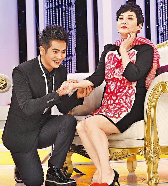 张晓龙(左)在《SS小燕之夜》录像现场下跪帮张小燕把脉。图片来源:台湾《苹果日报》