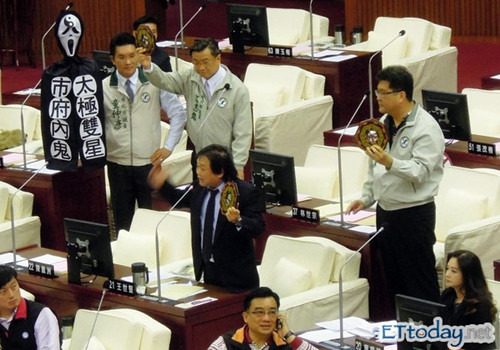 台北市议员拿照妖镜、死神像 怒吼市长就弊案道歉