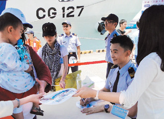 中新网6月9日电 据台湾《联合报》报道,台“海巡署”8日在基隆港东3码头举办“2013年世界海洋日”活动,吸引超过3500名民众到场,现场除展示海巡安检、救生装备,民众还可登上保钓护渔、最新型巡防舰的“新北舰”参观。在“海巡署”服役的郑元畅也在现场举行签名会,吸引大批粉丝排队要签名。