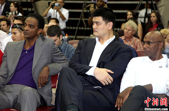 前火箭队明星中锋、休斯敦荣誉亲善大使姚明(右二)参加霍华德加盟火箭队的发布会为其助阵。 中新社发 王欢 摄