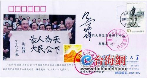 痴迷两岸大事纪念封 集邮迷喜获吴伯雄亲笔签名