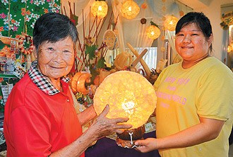 吴芳娥(右)将阿嬷年代的丝瓜络,设计成时尚的“地球灯”,81岁的阿嬷黄张玉兰称许年轻人的创意。联合报图