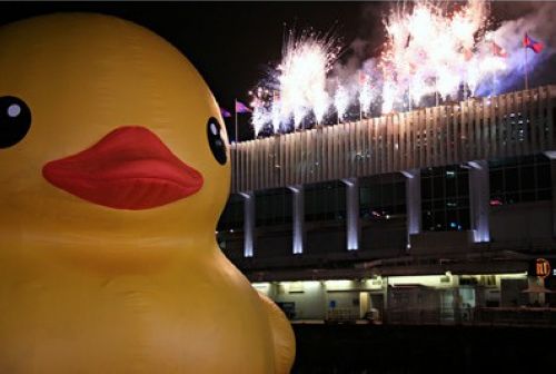 “橡皮鸭”即将离开香港,主办单位海港城于6月9日晚举行告别仪式,在海运码头大楼顶层放烟火。图片来源:台湾“中央社”