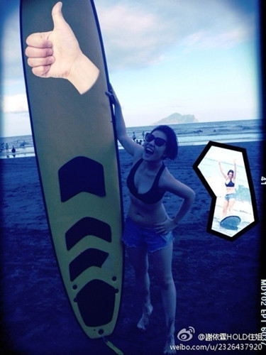中新网7月30日电 据台湾媒体报道,Hold住姐(谢依霖)因在电影《小时代》中表现抢眼,最近在两岸人气又大提升。近日宣传空档,她趁空到沙滩冲浪戏水,上身大方穿着比基尼,展现“事业线”。