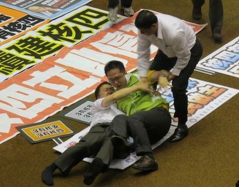 综合媒体报道,不满国民党“立法院”党团将在2日处理核四公投提案,在野党“立委”1日晚间先行霸占并夜宿台“立法院”议场,上午9点28分左右,国民党党团再度发起攻占主席台行动,朝野“立委”相互推挤,国民党中央政策会执行长林鸿池跟民进党“立委”邱志伟更扭打成一团跌坐在地,国民党团书记长赖士葆上衣还被扯破,民进党“立委”高志鹏更两度对国民党“立委”陈镇湘抛掷宝特水瓶,场面混乱。