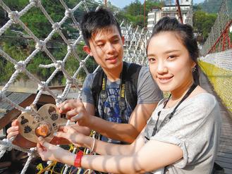 谷关业者因应情人节,制作“盐续情缘”吊饰,情侣在饰品上签名、许愿,并到谷关吊桥悬挂,可获众人与月下老人祝福。