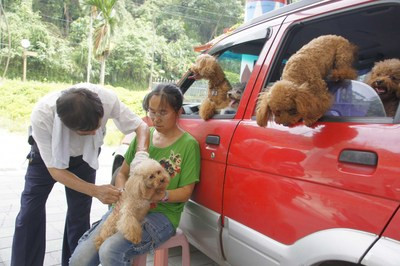 在狂犬病疫情较重的台湾南投县,民众带来一车8只贵宾狗,加入施打疫苗的行列。 台湾“中央社”图