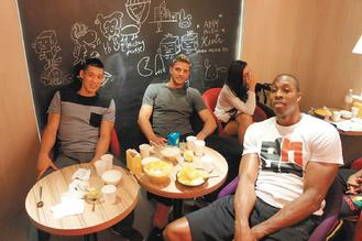 19日,NBA球星霍华德(右)原本预定要和林书豪(左起)、帕森斯钓虾的他,临时变更计划没去钓虾,前往品尝芒果冰。
