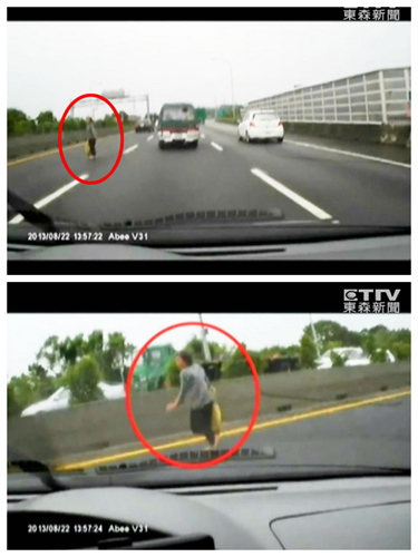 据台湾东森电视台网站报道,苗栗县一辆轿车行驶在高速公路上,当时下雨,视线受到影响,驾驶更加小心路况,突然间前方出现阵阵急促煞车声,看到前方厢型车停下来,驾驶立刻减速。一个人影从厢型车前方窜出,往内侧车道移动。