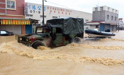 康妮台风29日为嘉义地区带来暴雨,嘉义县民雄乡、大林镇淹水严重。台湾军方派出救生艇前往救援。(台湾“中央社”图)