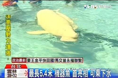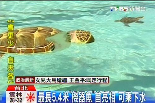 “长颈龙”造型的机器鱼首度亮相,10多个人抬下水,被称为像是尼斯湖水怪,足足有5.4米,还承受一个人坐在上面。这是来自日本的海洋学家林正道带领台湾的大学生们共同制作的。