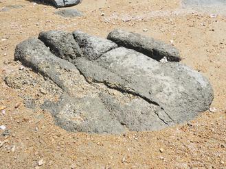 如来神掌石遭海岸作业挖掘机辗过,小指与无名指明显遭到破坏。 记者陈向鑫/摄影