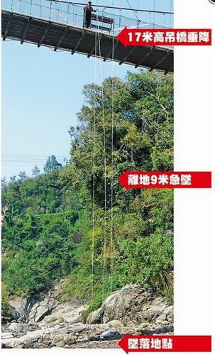 出事的苗栗县腾龙吊桥高17米,女学生王舒柔垂降到一半时,因绳索扣环松脱摔死。图片来源:台湾媒体