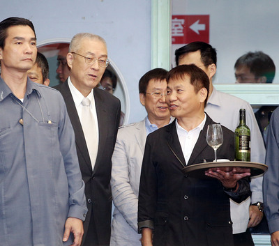 王品集团董事长戴胜益(前右)托盘出席开幕式。左2为台湾当局副领导人吴敦义。 台湾“中央社”图