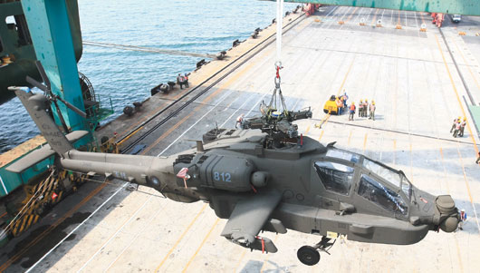 AH-64E在高雄港79号码头吊挂陈列,开始组装。图为尚未加装雷达与旋翼的机体。图自《联合报》