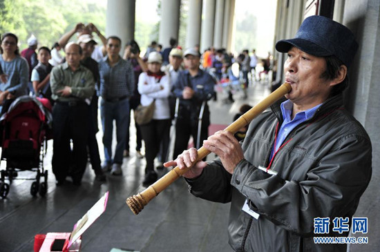参与互动(0) 11月17日,街头艺人张景阳展示吹奏洞箫技艺,接受评委审议。新华社发(吴景腾 摄)