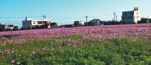 中坜市月桃路边,大波斯菊绽放成为一片花海。 图片来源:《联合报》