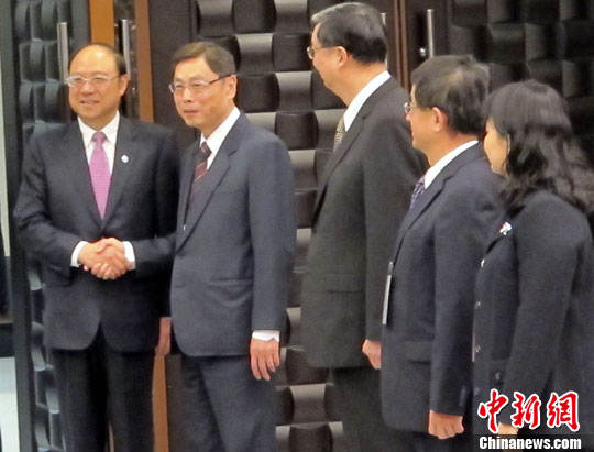 12月10日上午9时,“两岸经济合作委员会”第五次例会在台北“海基会”大楼举行。经合会大陆方面召集人、海协会常务副会长郑立中和首席代表、商务部副部长高燕率大陆方面经合会代表出席例会。图为郑立中(左)与台方召集人、海基会副董事长高孔廉在会谈开始时握手。中新社发 叶小刚 摄