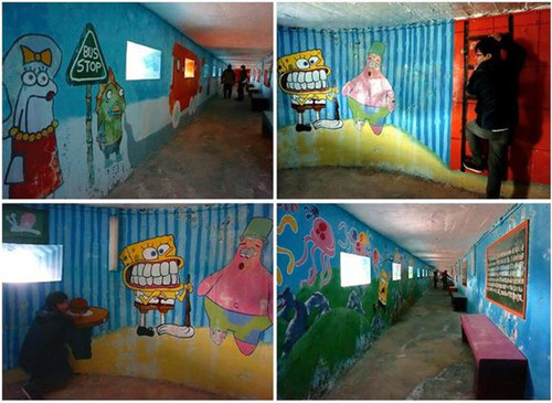 台湾一防空洞焕新生 墙壁绘海绵宝宝变艺术长廊