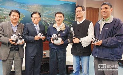 台北市议员王正德(图左起)、台盐董事长洪玺曜、市长郝龙斌、台盐艺术总监罗广维与市立动物园长金仕谦一同呼吁支持保护濒临绝种动物。(来源:台湾《中国时报》)