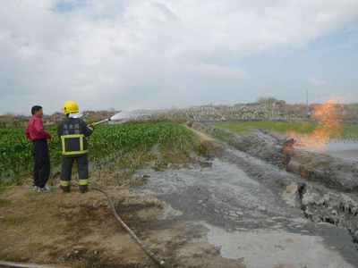 消防人员赶到现场马上喷水散温。而民众一群群聚在泥火山旁,好像在看世界奇景。