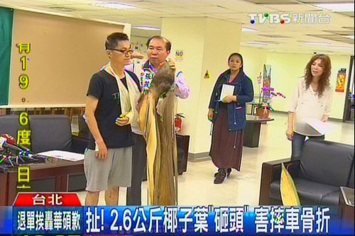 中新网4月17日电 据台湾TVBS新闻台报道,一位民众4月4日骑车行经台北市仁爱路,被重达2.6公斤的大王椰子落叶砸中头部,导致摔车、手部骨折。
